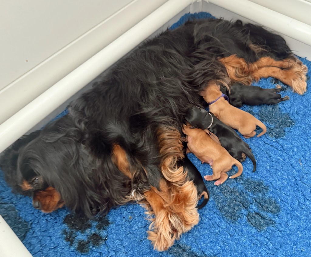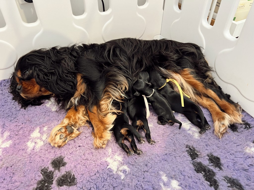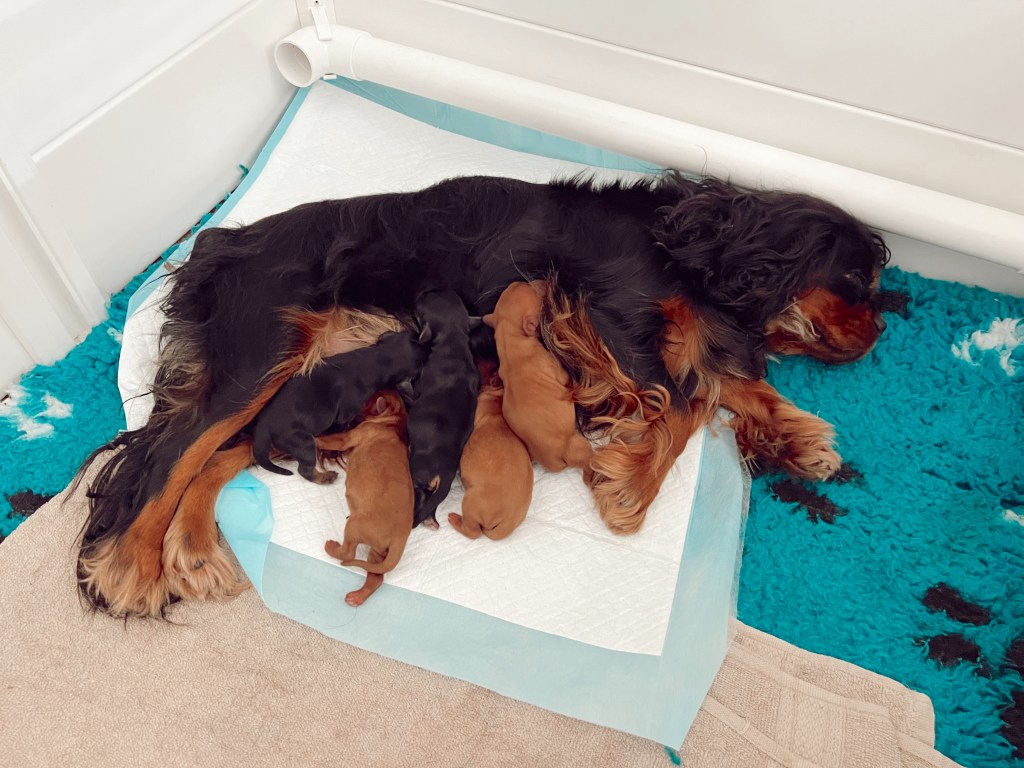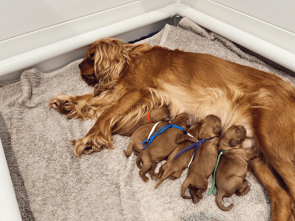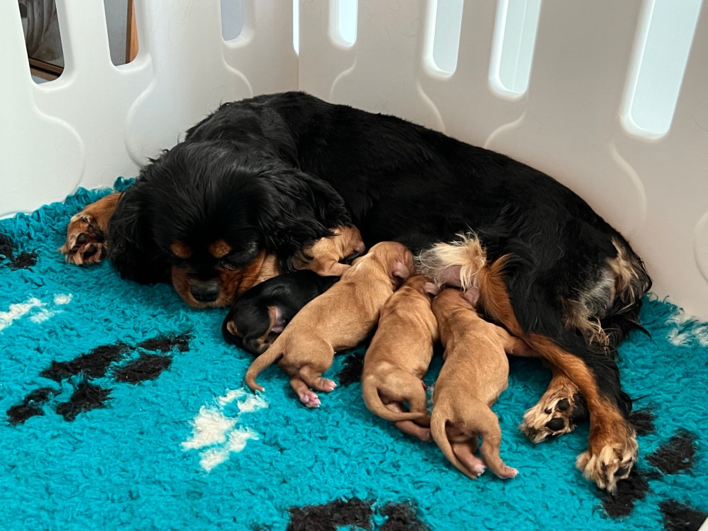 We’re so excited to welcome the Chadash Rivkah Nahars × Edenridge The Outlander ruby Cavalier puppies. Mum and all puppies are doing beautifully, soaking up those first precious days together.